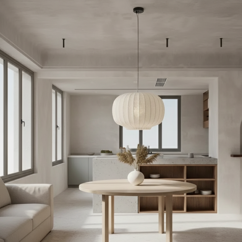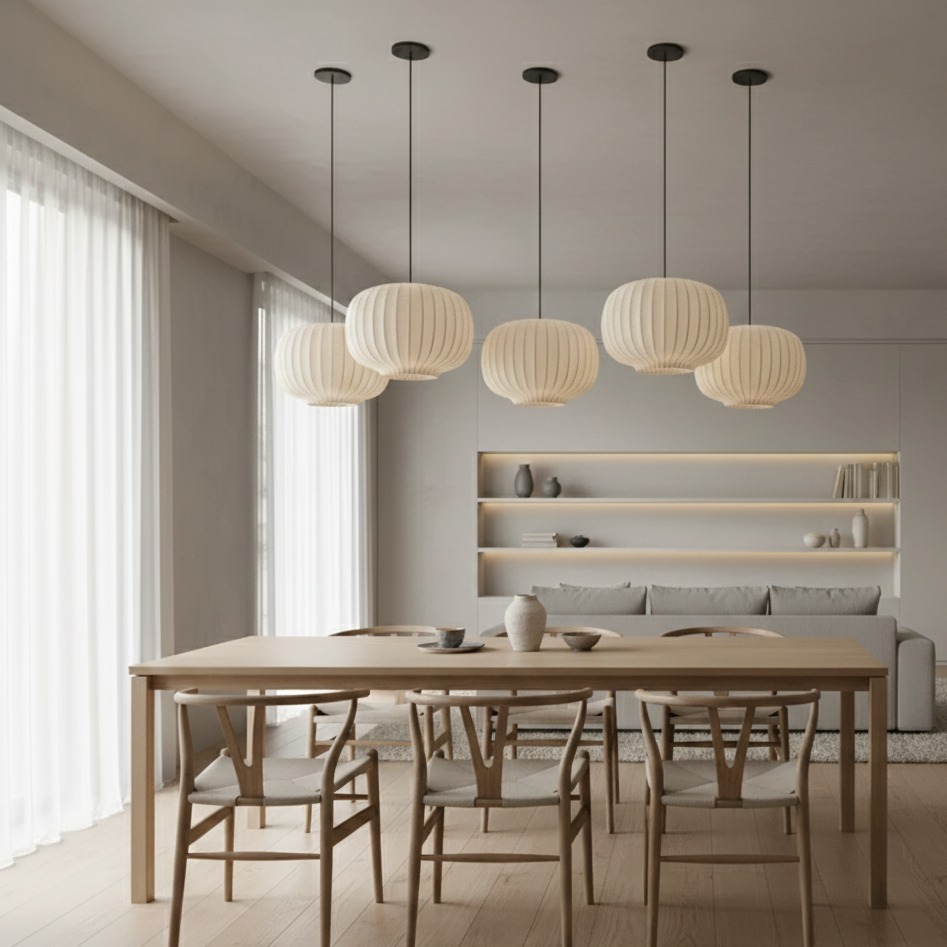 Aetheris combineert Deense eenvoud met Oosterse inspiratie – een hanglamp van zijde die elke ruimte vult met zacht, sfeervol licht.