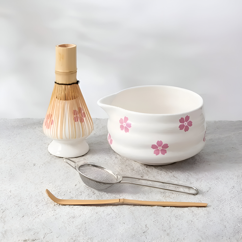 Weiße florale Matcha Set mit Keramikschale und Bambusbesen
